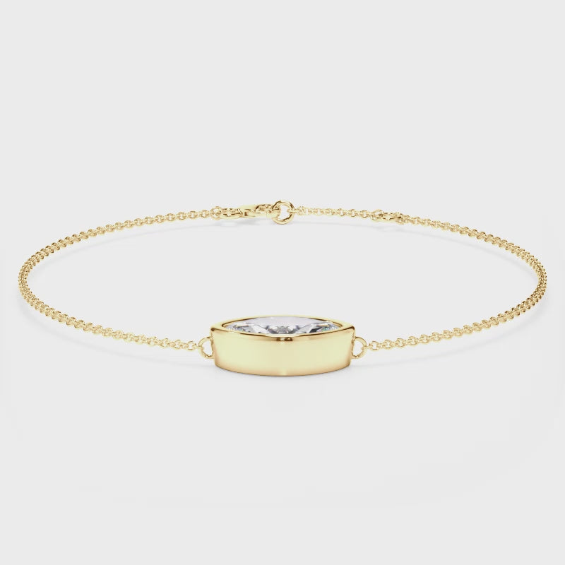 This timeless bezel set diamond bracelet, made with your choice of diamond centre stone, features a 1.00ct marquise cut laboratory-grown diamond set in 18ct gold. Exuding fluidity in its line work, and boasting an elegant silhouette, as with all the pieces in our Bespoke Collection, this piece is made especially for you.